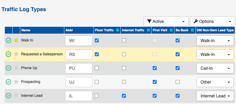 In Showroom Config > Traffic Log Types (see image), dealerships may have multiple traffic types marked as Floor Traffic, such as: