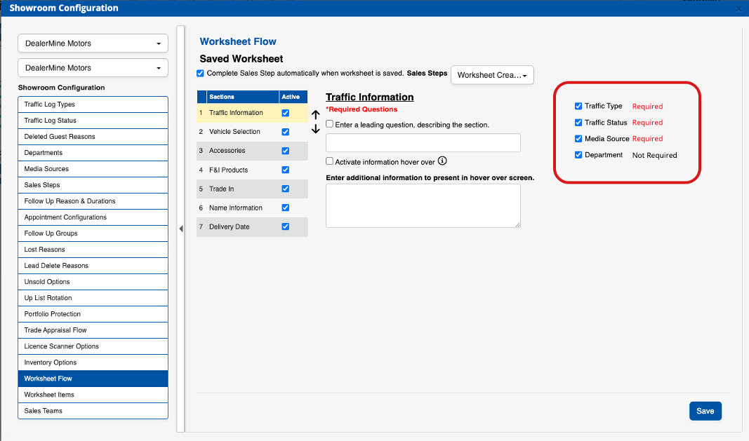 In Showroom Configuration > Worksheet Flow > Traffic Information each field is marked Required or Not Required.