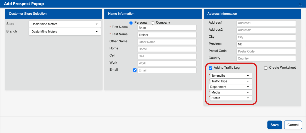 The Worksheet Flow - Traffic Information configuration allows dealerships to define which fields must be completed when adding a new piece of traffic or creating a prospect in DealerMine Sales CRM. This ensures that the Add to Traffic Log section in the Add Prospect Popup enforces only the fields the dealership considers mandatory.